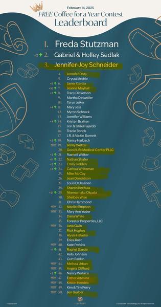 The latest Top 50 (as of Feb 14) for the FREE PRODUCT for a Year contest is