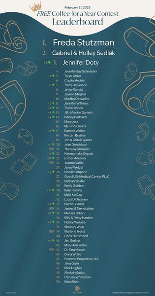 The latest Top 50 (as of Feb 21) for the FREE Coffee for a Year contest is here,