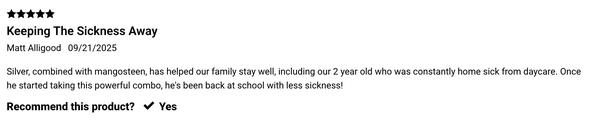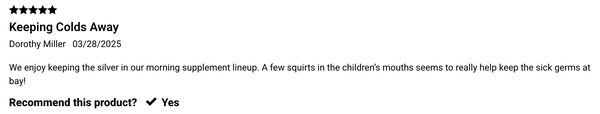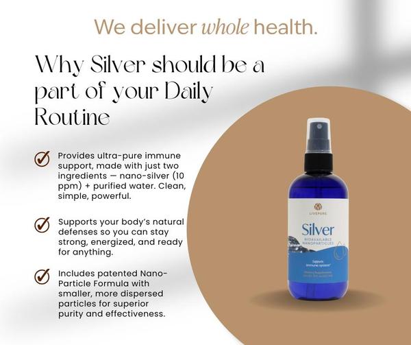 Why Silver Is a Daily Essential for the ENTIRE FAMILY In today’s fast-paced world, our immune systems face more demands than ever. Silver is designed to support your body’s natural defenses in a simple yet powerful way. It’s formulated with only two ingredients (silver + purified water) — no fillers, no