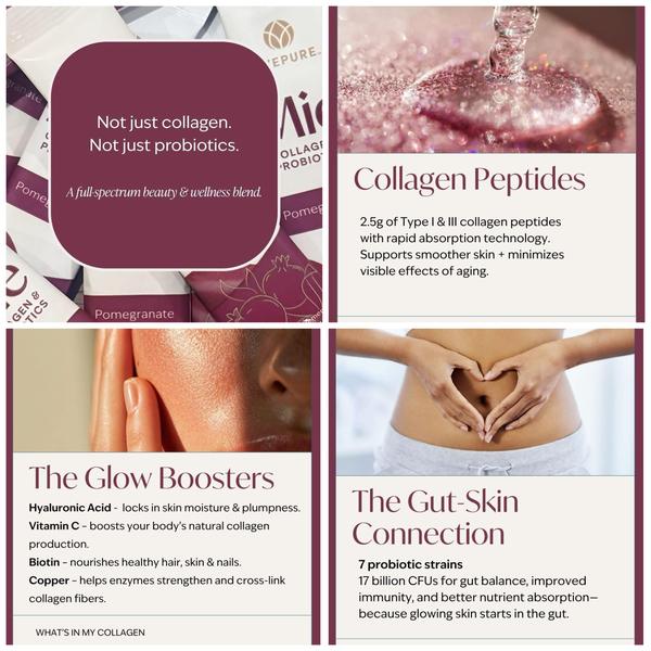 ultimate beauty punch. Collagen: 15 minutes rapid absorption using clinically tested Collagen Absorbing Technology Hydrolyzed bovine collagen peptides Type I and III to minimize the visible effects of aging Enhanced with Hyaluronic Acid, Vitamin C, Biotin and Copper to maximize health for skin, hair and nails Probiotics: 7 complementary strains for achieving gut wellness, including Lactobacillus plantarum LP-115® 17 billion CFUs of friendly gut bacteria help with improved immunity and balanced digestion