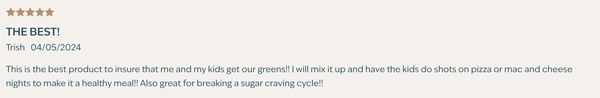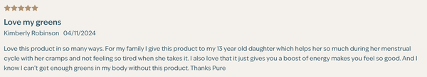"I love my greens! It really helps keep my iron up during my monthly cycle! I don’t cramp as bad, I don’t feel light headed, and I get all the extra vitamins my body needs :)" -Kaitlyn "If you're not a fan of the raw taste