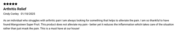 "Mangosteen has become one of my favorite products that i will not go a day without. Before i stared using Mangosteen i had to get shots in my knee every three months for pain relief. It has been 10 months since i've had a shot in my knee Every morning i Take Mangosteen, Noni, and Organic Sulfur. Now my knee feels great without the $350 shots...Thanks!!"